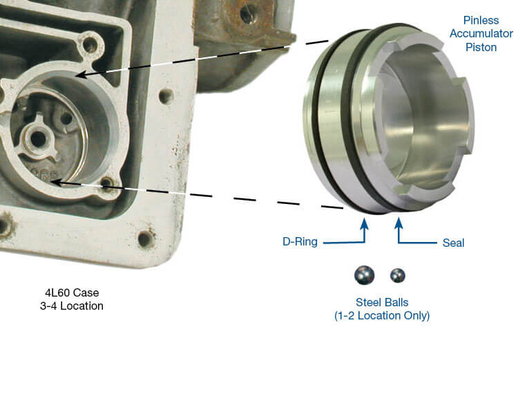 In listed GM units, it is common to have poor shift quality, burnt bands or clutches due to accumulator piston wear. Repeated reciprocation of the accumulator piston causes wear at the piston pin bore interface. After this wear reaches a critical point, fluid loss through the piston pin bore cannot be compensated due to lack of pump volume. In addition, the piston can get cocked and gall the accumulator bore due to the pin bore wear or the spring bottoming out. To prevent these conditions in the 1-2 or 3-4 accumulator bores, Sonnax offers pinless accumulator piston kit 77998-03K.
